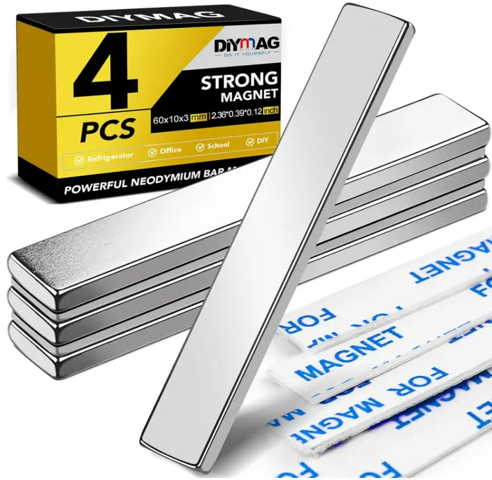DIYMAG Strong Neodymium Bar Magnets, Rare Earth Magnets with Double-Sided Adhesive, Heavy Duty Magnet Perfect for Kitchen, DIY, Fridge, Garage, Science, Craft, Office-60x10x3mm, 4 Packs